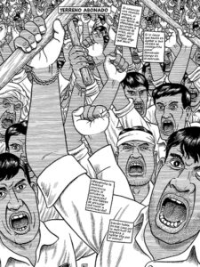 Desfiladero Ediciones ha recuperado en un único tomo dos álbumes de los ochenta del alicantino Miguel Calatayud, gran referente de dibujantes valencianos (precursor de la llamada “Nueva Escuela Valenciana”) y una de las figuras más respetadas de la ilustración y el cómic español, por sus series para la revista Trinca, sus trabajos de ilustración infantil y sus encargos para carteles de todo pelaje. Ha sido Premio Nacional de Ilustración tres veces, para más señas. En La pista atlántica Calatayud coloca al típico investigador privado y a su socio, rudos hombres duros de antaño, en un entorno futurista, un planeta superpoblado en el que los humanos tratan de ganarle terreno al mar, entre otros medios, construyendo una plataforma que comunica el continente americano con la vieja Europa. Un encuentro entre el género policiaco y el futurismo, que en el fondo no es tan futurista, se siguen programando espectáculos de varietés, los teléfonos no son inalámbricos y la luz de los faros continúa guiando el tráfico marítimo. En blanco y negro (y gris), con un trazo vanguardista (recordamos que fue publicado en los años ochenta), y una rotulación muy característica en la que las “S” se estiran somnolientas, Gili Lacosta y Romo investigan tramas surtidas de asesinatos, verdades a medias, suplantaciones y corruptelas. AU