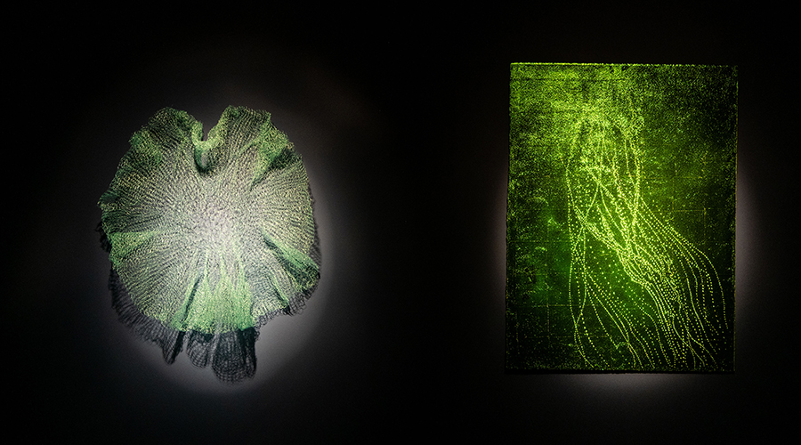 L’energia de la natura és una gran artista i una gran artesana, treballa incansablement per a preservar la vida a través de la creació d’una immensa varietat d’éssers amb formes i colors fascinants. Conviuen amb nosaltres, però rara vegada reben l’atenció que mereixen. Aquesta nova sèrie de perforacions naix d’un grup anterior d’obres on clavava milers d’agulles sobre una superfície de seda; podreu veure’n una a l’exposició. Durant el procés, em vaig adonar que l’acció de perforar es perdia en la recerca del resultat final. Així que vaig decidir centrar-me en aquesta part del procés i usar-la com a llenguatge. En observar de prop els éssers marins, vaig descobrir un patró repetitiu en el món micro: una repetició imperfecta que es reflecteix en les seves formes i colors. La sèrie està composta per un grup d’obres sobre paper amb colors vibrants, que s’aproximen a les mateixes sensacions que els colors del fons submarí ens aporten, i que es perden al treure’ls a la superfície.