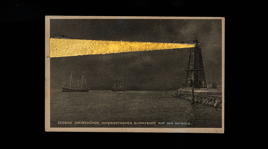 El minimalisme moltes vegades no és el resultat d’una acció precisa i intuïtiva, sinó més aviat la capacitat de prescindir del que és innecessari per quedar-se amb l’essència. En el meu cas, ho he treballat. La meua tendència, també per la meua cultura, és més barroca, però el contacte amb l’estètica del nord d’Europa m’ha influït en aquest sentit. Al final, el teu llenguatge és una hibridació de tot el que vius i observes. La mínima intervenció sobre postals antigues traçant una línia d’horitzó de color daurat tracta de parar la tempesta. Es tracta d’una cerca constant de l’horitzó, que ens fa avançar i que, al mateix temps, és inabastable. La força de la vida que ens manté vius malgrat les dificultats. A la mostra, el meu acostament al mar és existencial. Em pare en algunes de les seues profunditats per parlar de por, auxili, deriva, far i estratigrafia. Conceptes no només lligats al mar, sinó també a la complexitat de la vida.