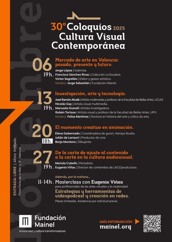 A las 7 de la tarde, excepto el jueves 20 que será una hora antes, la sede de Mainel (en Porta de la Mar, 6, 8ª) acogerá cuatro sesiones monotemáticas en torno al mercado del arte valenciano, la investigación y tecnología vinculadas al arte, la animación y los vídeopodcast. Todos los coloquios son gratuitos y la entrada es libre hasta completar el aforo. Eso sí, por cuestiones organizativas, agradecemos inscripción previa.