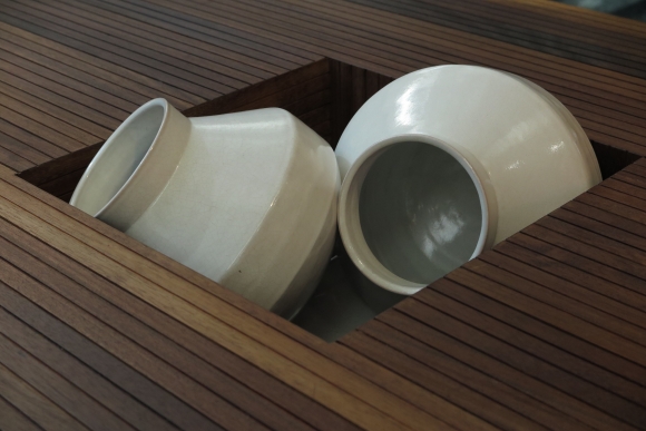 Perquè si girem un poc el coll, la forma i la proposta estètica es metamorfosegen per a esdevindre un cant a l’estructura mesurada, a la solidesa que empara el forat i protegeix la peça que desencadena totes les certeses: A mesa das mazás. Amb ecos de Vkhutemas, l’escola de disseny que pol·linitza les avantguardes russes i allarga la vista cap a l’art industrial, l’objecte que inspira i respira en l’obra, després de passar pel modelatge en fang i el vidratge d’un exquisit ceramista, va ser ideat com a prototip. El contrast de textures i de materials, un altre dels traços de Bernardo Tejeda, respon a la variació interminable d’artefactes amb què indaga un resultat que necessitem tocar per a poder pensar-lo.