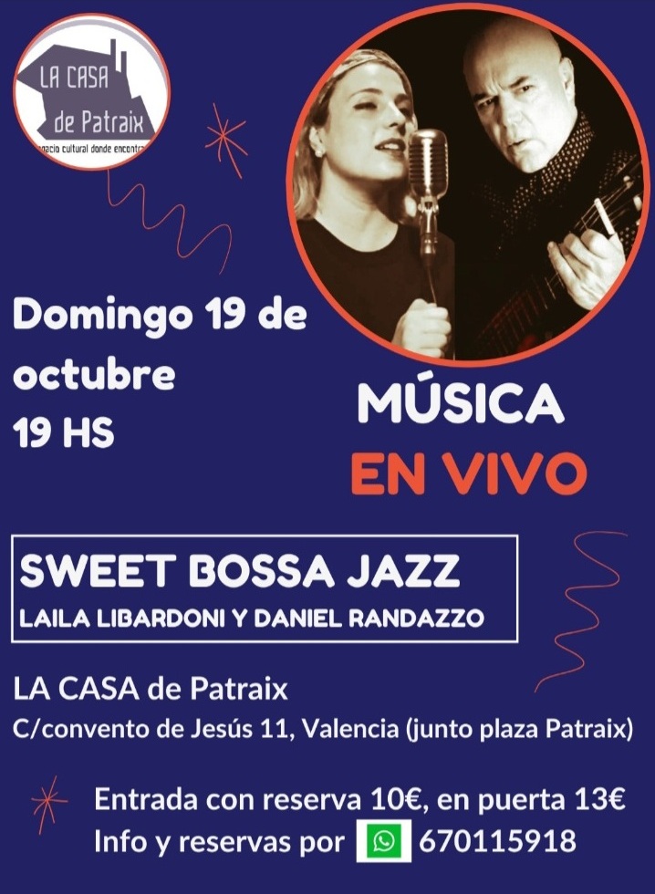 Sweet Bossa Jazz, formado por Laila Libardoni y Daniel Randazzo, dos músicos internacionales con trayectorias musicales en Argentina, brasil, Irlanda y Portugal, nos presentan su CONCIERTO en formato acústico, dúo vocal y guitarra. Lo mejor de la Bossa nova y algunos estándares del Jazz; interpretando a los grandes maestros como Tom Jobim, Vinicius de Moraes y Ary Barroso entre otros.