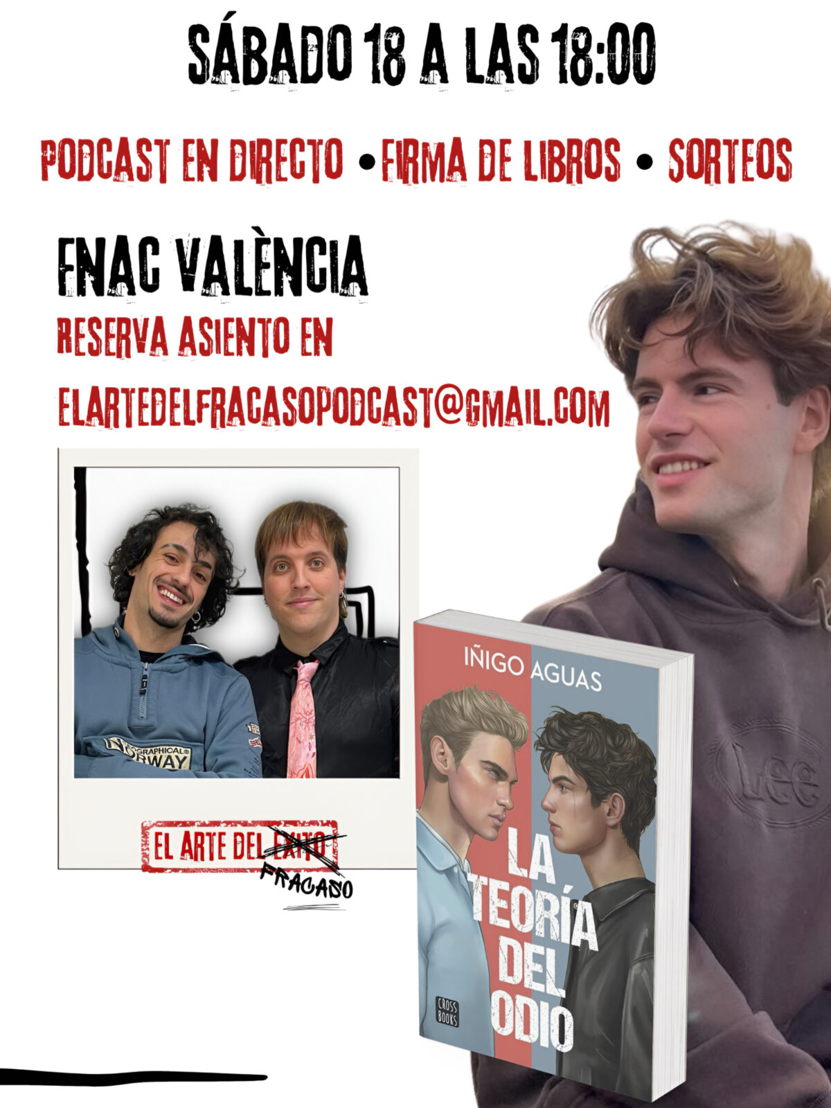 Saturday 18 April to 18:00h vuelve el podcast de moda Valenciano al Fórum de FNAC con un nuevo episodio en directo y esta vez con un invitado muy especial, el escritor Iñigo Aguas que viene a presentar su nuevo libro, La Teoría. Del Odio de CrossBooks del Grupo Planeta.