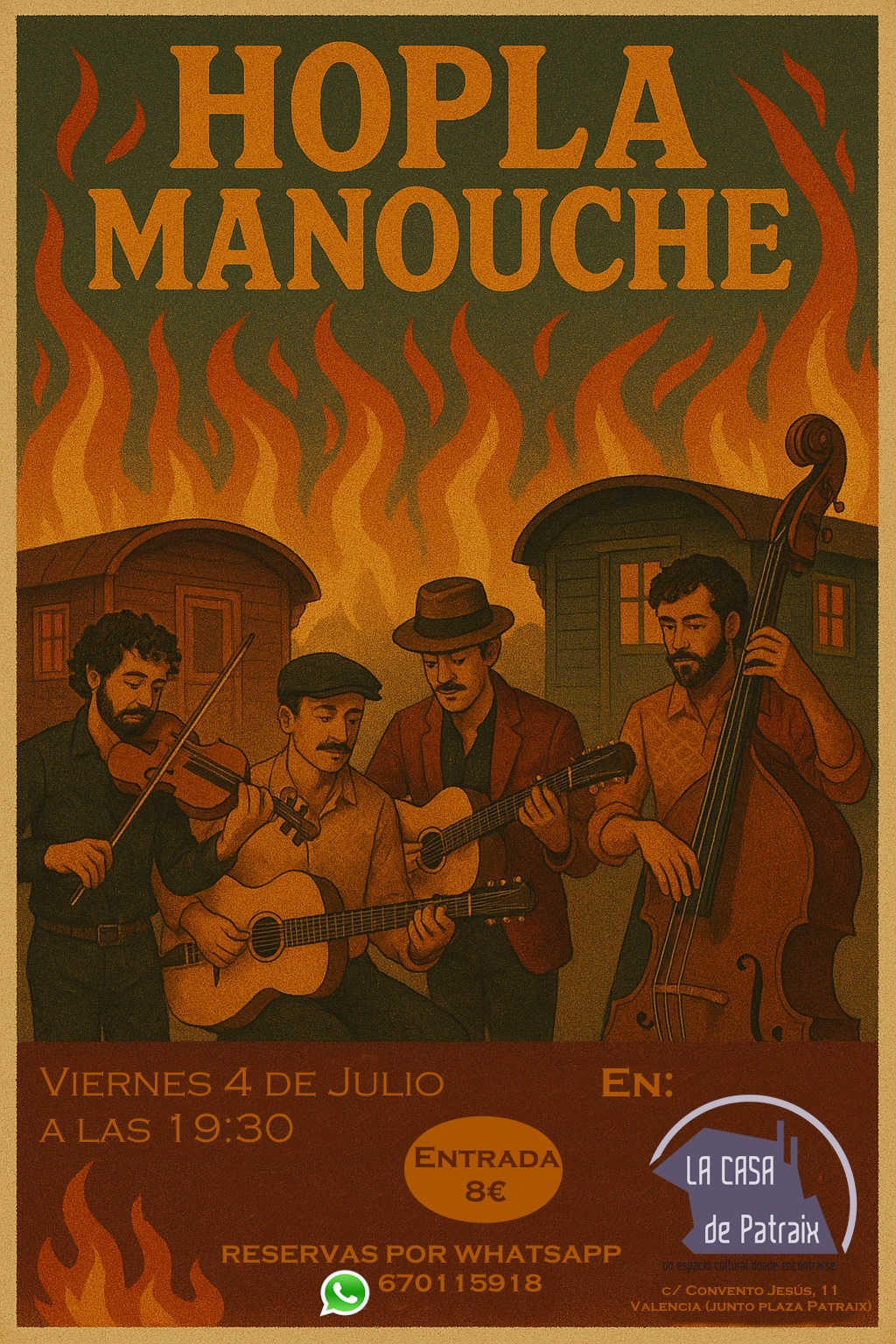 Hopla Manouche es un grupo de Jazz Manouche formado en 2018 por la pasión común originada por el genio musical de Django Reinhardt y su Hot Club de France. Este estilo musical nace en la Francia de los años 1930 tras la llegada del Jazz norteamericano. El estilo “manouche” es la mezcla del jazz tradicional americano y el swing con el “bal musette”, canciones francesas y música Klezmer. Sus instrumentos tradicionales son guitarras, contrabajo y violin, sin vientos ni percusión. El dúo Django Reinhardt y Stephane Grappelli fueron los pioneros de la música que nos inspira y seguimos compartiendo 90 años después. Al día de hoy, el cuarteto Hopla Manouche intenta transmitir y mantener este estilo de música tan especial con sus ritmos cambiantes, la famosa “pompe”, las improvisaciones muy especificas y la emoción musical y pasional.