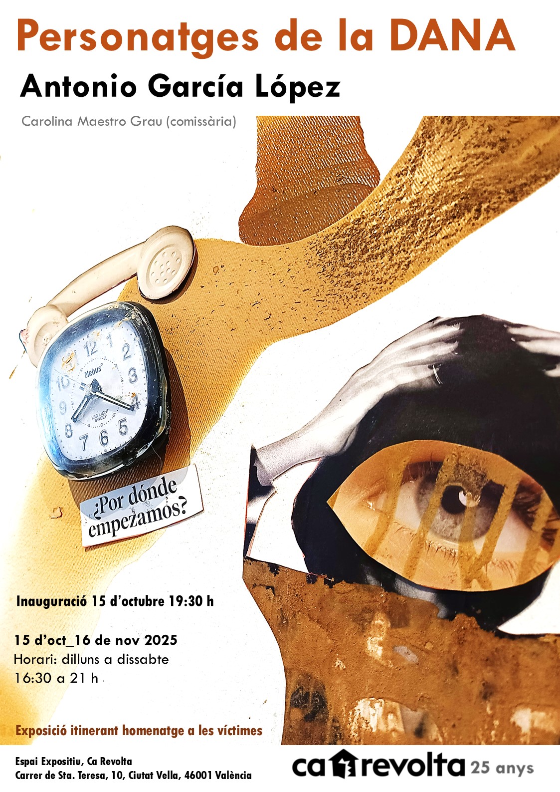 Personajes de la Dana, es un proyecto itinerante que se ofrece a aquellas sedes que como ya lo han hecho Archena (Murcia) o LÉliana (Valencia) estén dispuestas a acogerlo. En esta ocasión y bajo la denominación valenciana de “Personatges de la DANA”, será mostrado entre el 15 de octubre y el 16 de noviembre en el centro de la ciudad de Valencia de la mano de Ca Revolta. Esta nueva sede dada su privilegiada localización es ideal para ofrecer un sentido homenaje desde el arte a las 229 víctimas mortales que esta terrible catástrofe causó hace ahora un año. Cada nuevo espacio donde es mostrado este proyecto contribuye a mantener vivo el recuerdo de un suceso que nunca debería normalizar el alto coste de vidas cobradas.