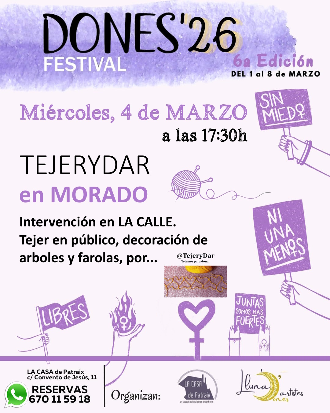 Seguimos en la semana de la DONA, en el FESTIVAL DONES’26 junto a TEJERYDAR, hemos organizado una Intervención en LA CALLE, el miércoles 4 de marzo, a partir de las 18:00h. Tejeremos en público, decoraremos las farolas y los arboles, con piezas artesanales hechas de ganchillo (crochet) y dos agujas, y todo en colores morados y rosas. Si quieres venir a tejer con nosotras, puedes confirmar tu asistencia por WhatsApp al 670115918, TRAE TUS AGUJAS y si tienes alguna lana morada o rosa, también es bienvenida.