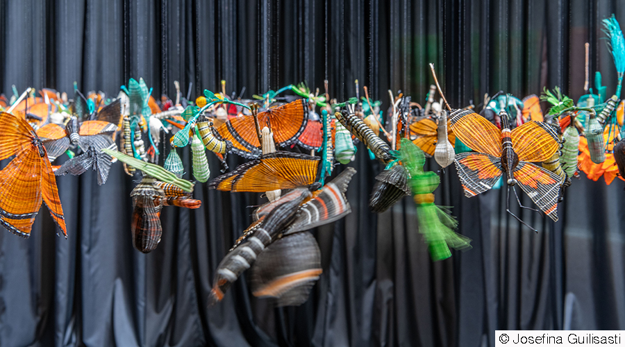 Muchas de las artistas que exponen en In half light han desarrollado sus piezas en comunidad. Pilar Albarracin, For example, trabaja con grupos de bordadoras que ejecutan piezas como la pancarta que cuelga del IVAM con la palabra “Guapa!” bordada a la manera tradicional. Aquí el bordado sale de lo íntimo y lo doméstico para operar también como lenguaje político. Otro ejemplo es el de Josefina Guilisasti, que presenta una pieza —la más llamativa, quizá— hecha en colaboración con doce artesanas de la comunidad Rari de Chile, reconocidas por su dominio del tejido en crin de caballo. Con esta técnica han creado piezas que rinden homenaje a la mariposa Monarca, símbolo de fragilidad y persistencia, por ser capaces de ejecutar una de las migraciones más largas del mundo, de México a Canadá. Sonia Navarro también trabaja de forma colectiva, con mujeres que mantienen viva la manufactura con esparto en su Murcia natal, donde vivió de primera mano el declive de esta industria. Ella aprendió a coser junto a su madre, sus tías y sus abuelas, y resignifica este oficio milenario hecho con fibras naturales como un gesto político y un homenaje a los saberes asociados al hogar y a los cuidados. Emplea esparto cosido en la obra Espartaria V (2024), una mezcla de pintura, escultura y tapiz. También incorpora el esparto Ana Laura Aláez, trenzando fibras vegetales que evocan mechones de cabello en la pieza Hilera de traiciones. Finally, Jessica Stockholder, conocida por transformar objetos cotidianos en arquitecturas cromáticas y espaciales, ha colaborado con artesanos mallorquines que trabajan técnicas tradicionales como la llatra (trenzado con hojas de palmito) to create Cardinal directions (2025), una estructura suspendida, compuesta por cestos, redes y cabos.
