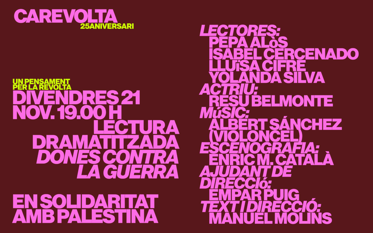 Obra teatral "DONES CONTRA LA GUERRA", del dramaturg Manuel Molins. Amb les intervencions de l'actriu Resu Belmonte, les lectures de Pepa Alòs, Isabel Cercenado, Lluïsa Cifre i Yolanda Silva. Música d'Albert Sánchez i escenografia d'Enric M. Català. Ajudant de direcció: Empar Puig.