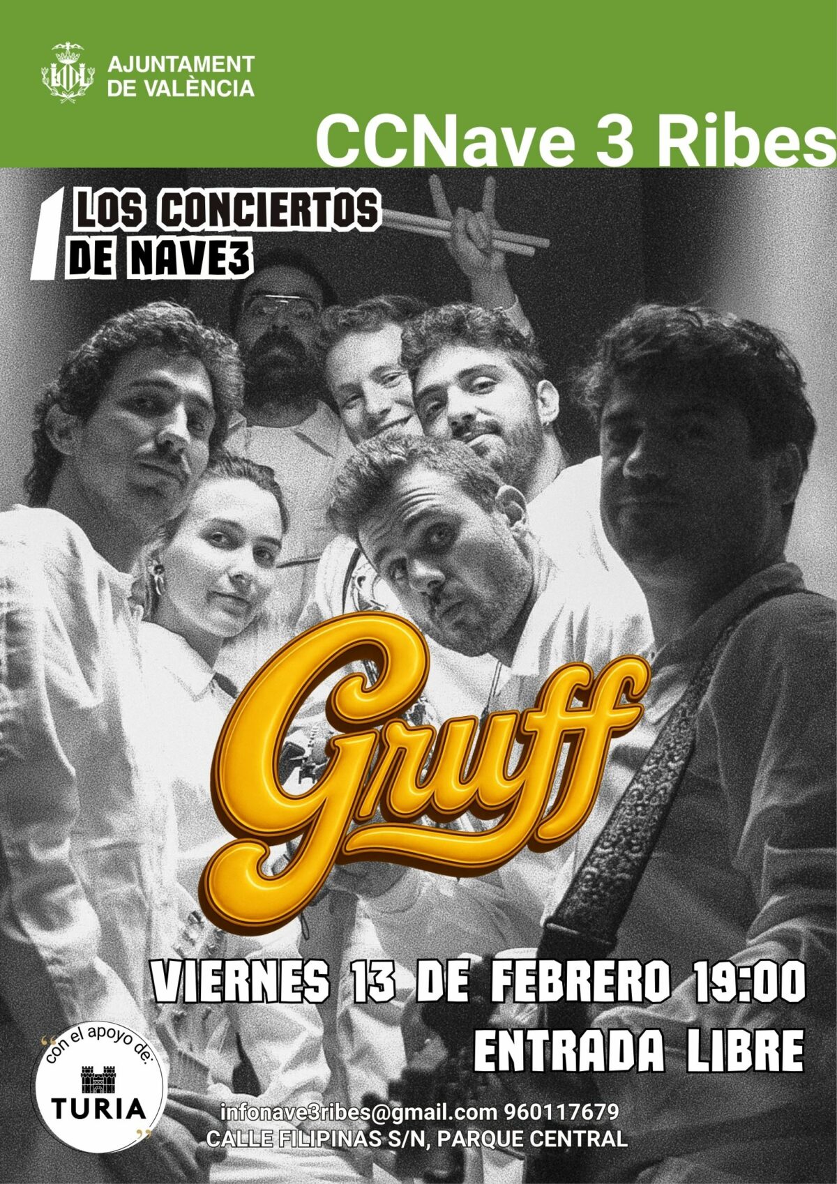 El ciclo Los conciertos de Nave 3 presenta a GRUFF, un colectivo valenciano que reivindica la música con alma y ritmo a través de una fusión vibrante de funk, soul, hip hop clásico y groove ochentero. La banda —formada por batería, bajo, dos guitarras, piano, saxofón y voces— propone un directo lleno de energía, capas ... Leer más