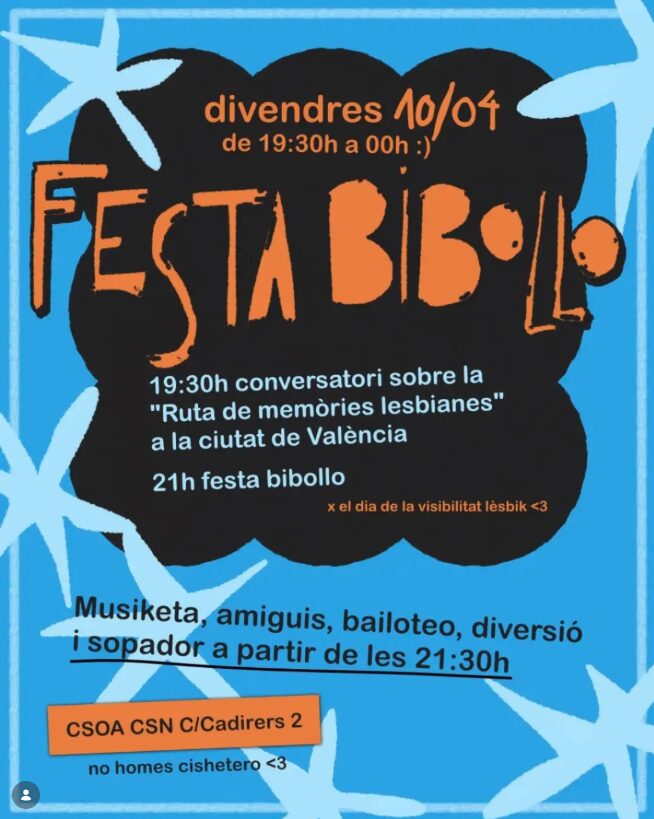 Ens tornem a trobar a la Festa Bibollo aquest divendres 10 d’abril per celebrar les realitats lèsbiques des de la memòria a la ciutat de València. Farem un conversatori al voltant de la Ruta de Memòries Lèsbiques (2024), impulsada per companyes de l' @assembleafeminista junt amb activistes feministes i lesbianes que van protagonitzar la lluita dels anys ... Leer más