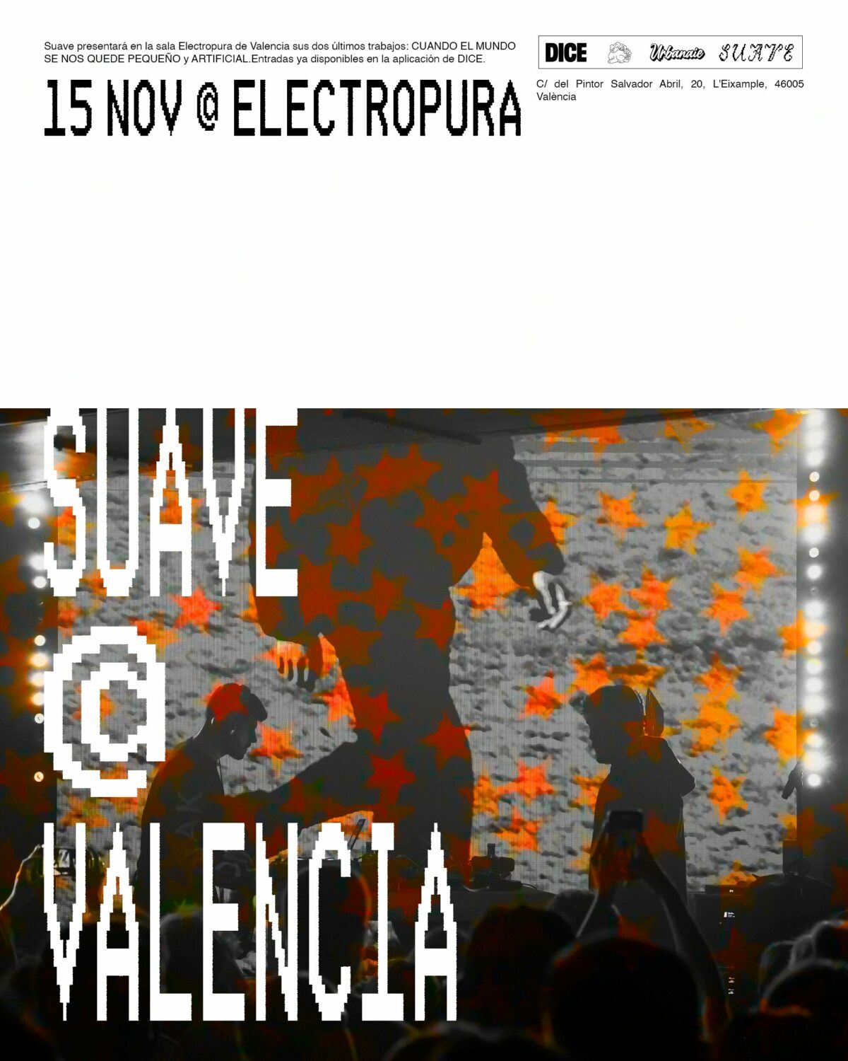 Electropura Pintor Salvador Abril, 20, ValènciaSuave presenta por primera vez en Valencia "ARTIFICIAL" y "CUANDO EL MUNDO SE NOS QUEDE PEQUEÑO" tras pasar por festivales y ciclos como Sound Isidro o WARM UP Festival.