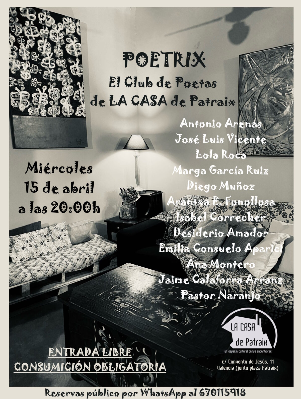 POETRIX es un encuentro de poetas, de cualquier parte del mundo, que se reúnen en LA CASA para recitar sus poemas o los de otros, además de poder poder compartir inquietudes, próximos pasos, información… Hacemos dos rondas: 1 ronda. Cada poeta lee un poema de uno de sus compañeros, asignados al azar. 2 ronda. Los ... Leer más