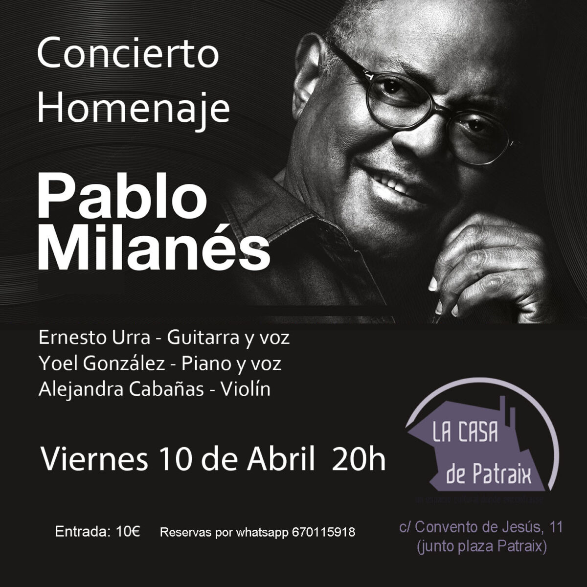 Homenaje a Pablo Milanés a cargo de MESTIZando: Pablo Milanés es uno de los músicos cubanos más reconocidos y queridos. Le hacemos homenaje a toda su carrera y su vida dedicada a promover la cultura cubana. Interpretes:– ERNESTO URRA : Guitarra y voz (Cuba)– YOEL GONZÁLEZ : Piano y Voz (Cuba)– ALEJANDRA CABAÑAS: Violín y voz (Paraguay) Reservas por whatsapp ... Leer más