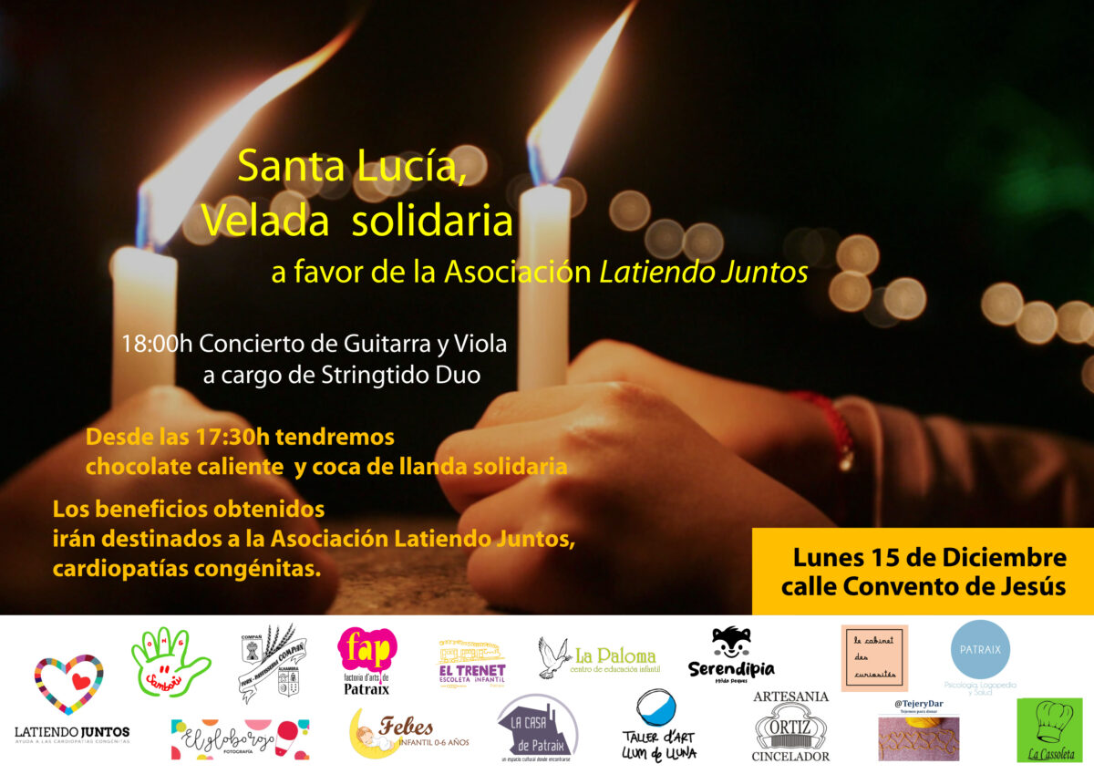 Volvemos este año a celebrar la Velada Solidaria, el día de Santa Lucía, el 15 de diciembre, esta vez lo que se recoja por el chocolate, rico rico, y la coca de llanda, superrica, será donado LATIENDO JUNTOS Latiendo Juntos es una asociación sin ánimo de lucro, dedicada a la atención de personas con cardiopatía congénita y sus familiares. ... Leer más