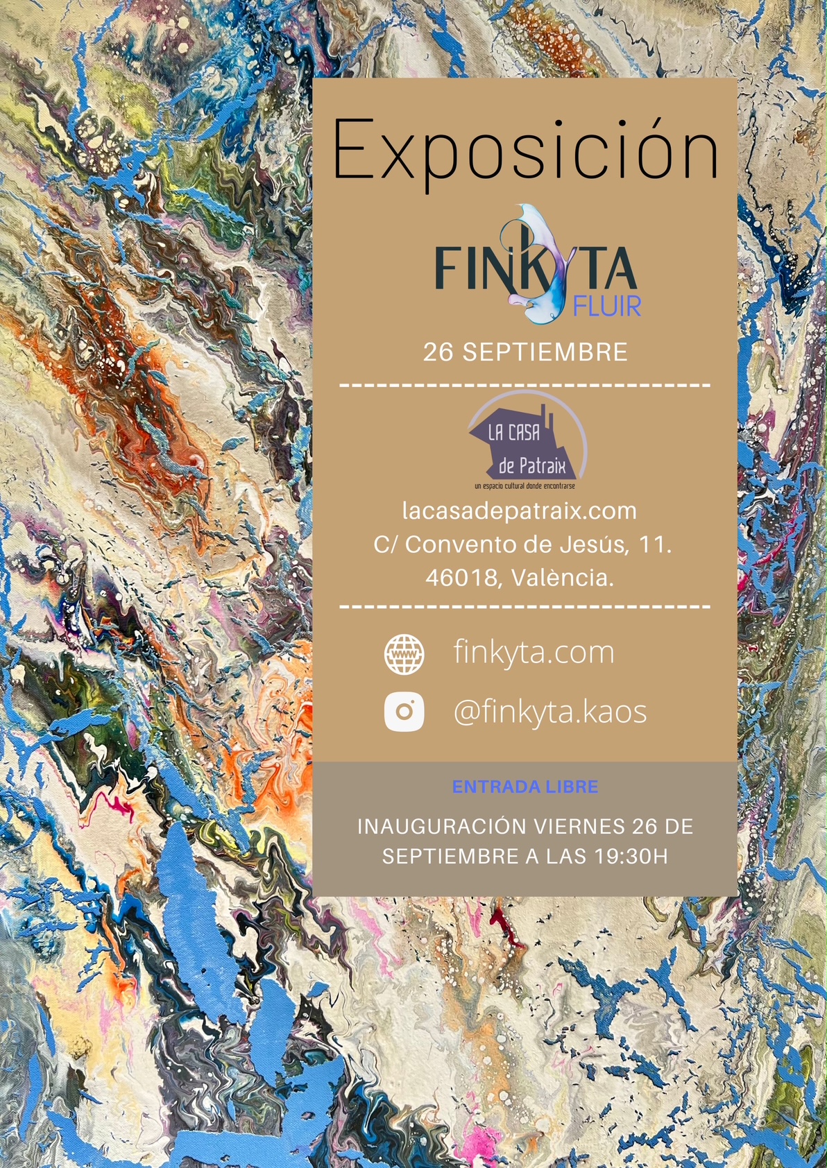 El próximo viernes 26 de septiembre a las 19:30h, Finkyta presenta su exposición Finkyta Fluir en LA CASA. Una muestra vibrante donde el arte fluido (pouring) y las técnicas con pintura acrílica se convierten en una experiencia sensorial única. Cada obra invita a dejarse llevar, a descubrir cómo los colores se encuentran, dialogan y evolucionan ... Leer más