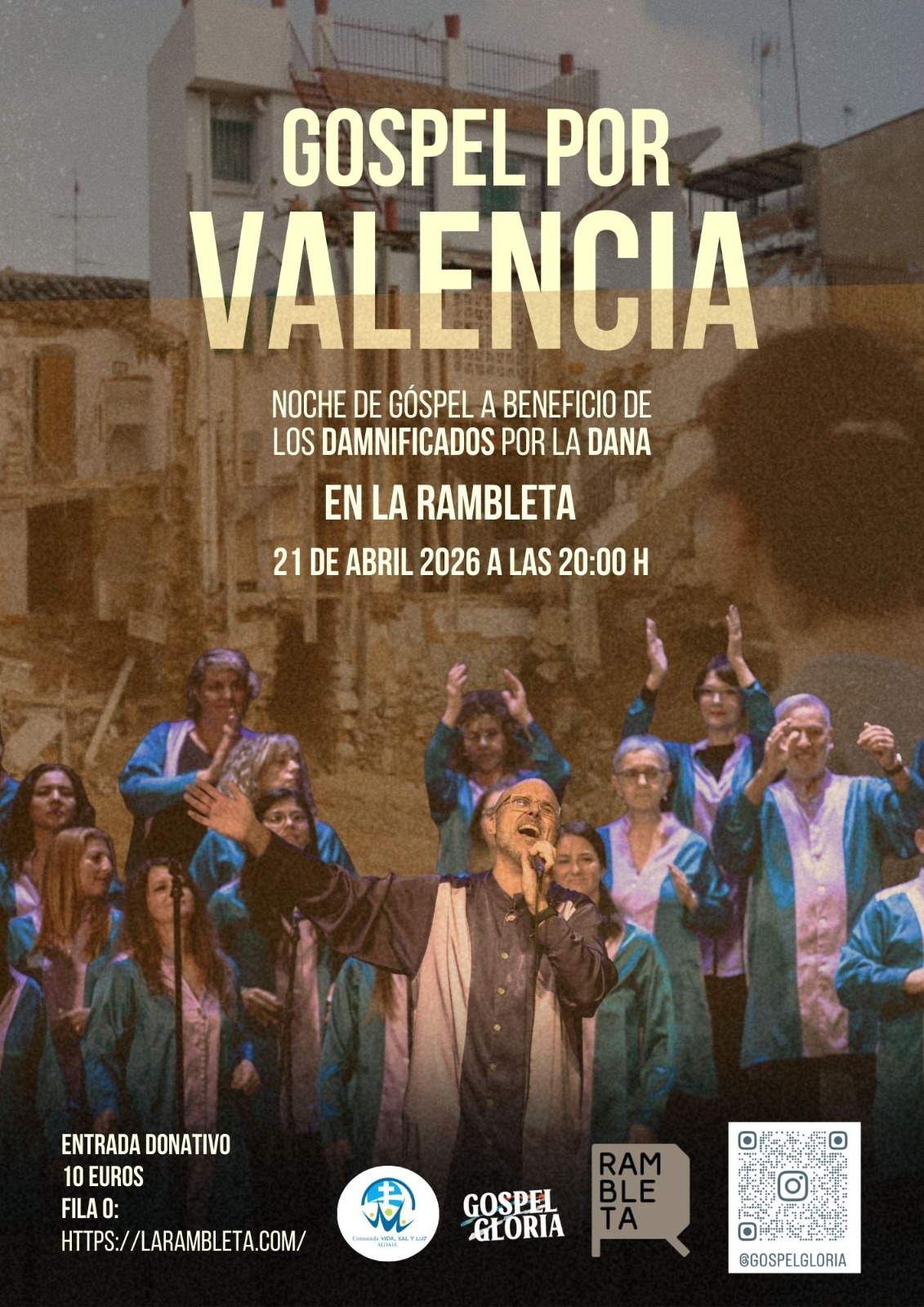 Noche de Gospel a beneficio de los damnificados por la DANA organizado por el coro GOSPEL GLORIA en La Rambleta el próximo martes 21 de Abril a las 20:00 horas.