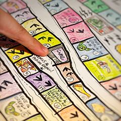 Partint de l’esquema del joc de l’oca, anem a inventar les nostres regles i a il·lustrar cada casella amb proves boges i emocionants. Per al disseny podem triar: la selva, l’espai exterior, l’antic Egipte o un regne de fantasia. AU