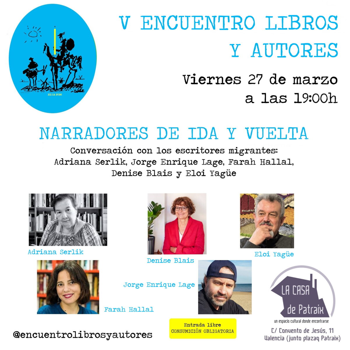 3º día del V Encuentro LIBROS Y AUTORES (ELYA 2026), la tarde la dedicamos a «NARRADORES DE IDA Y VUELTA» El viernes 27 de marzo, a las 19:00h. Conversaremos con los escritores migrantes: Adriana