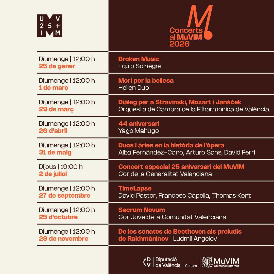 The MuVIM presents the lineup of its annual recital program 'Concerts at the MuVIM 2026' made up of a careful selection of composers and performers, January to November, they will turn the meeting room of the museum of the Provincial Council of Valencia into a space for dialogue between tradition and modernity, offering the public the possibility to approach ... Read more